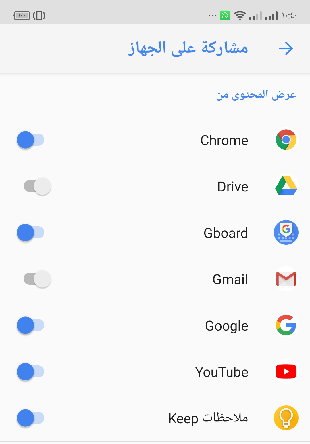 افتراضيًا، يتم تعيين جميع تطبيقات Google للسماح بالمشاركة على الجهاز.