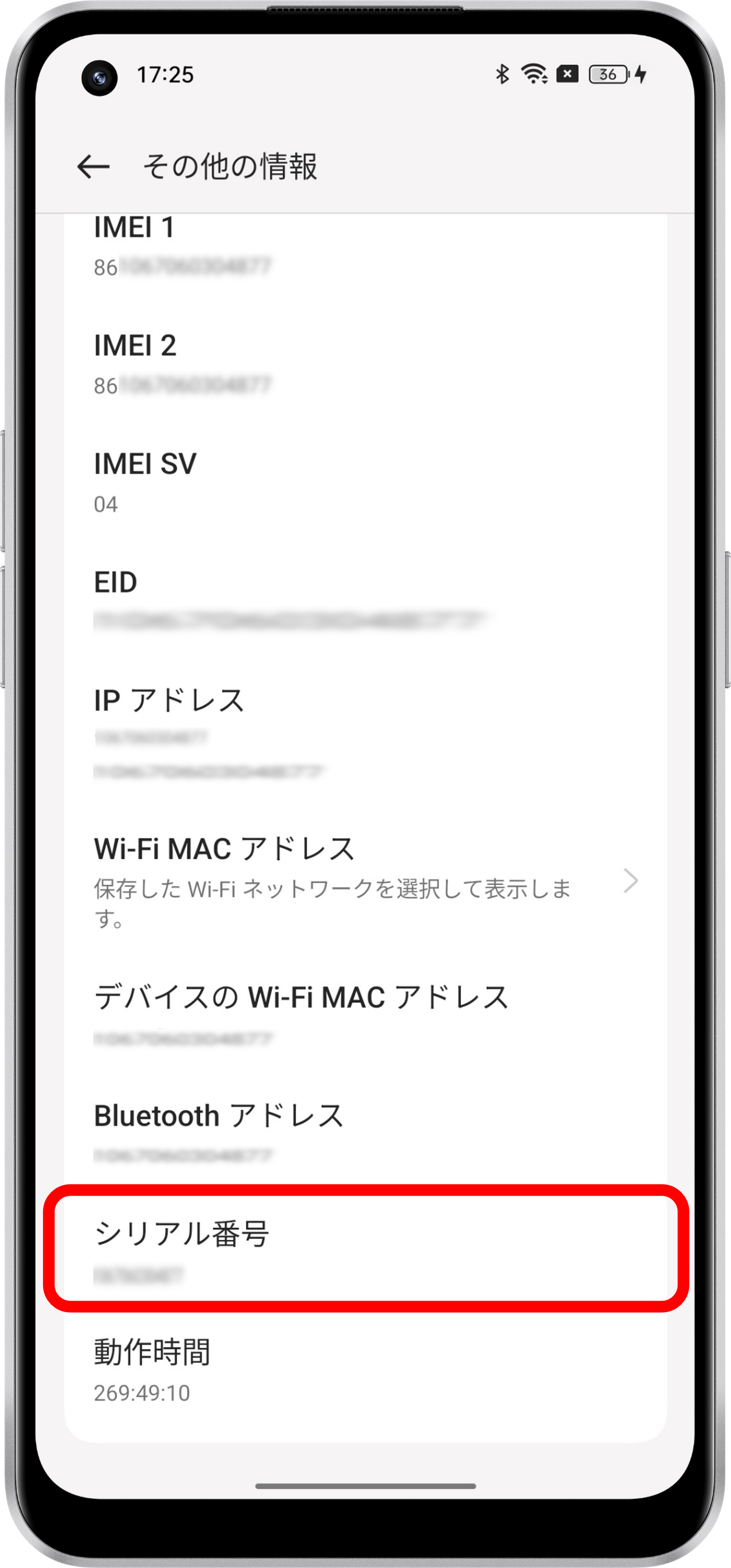 ColorOS 12 以降:[設定]>[デバイスについて]>[その他の情報]>[シリアル番号]