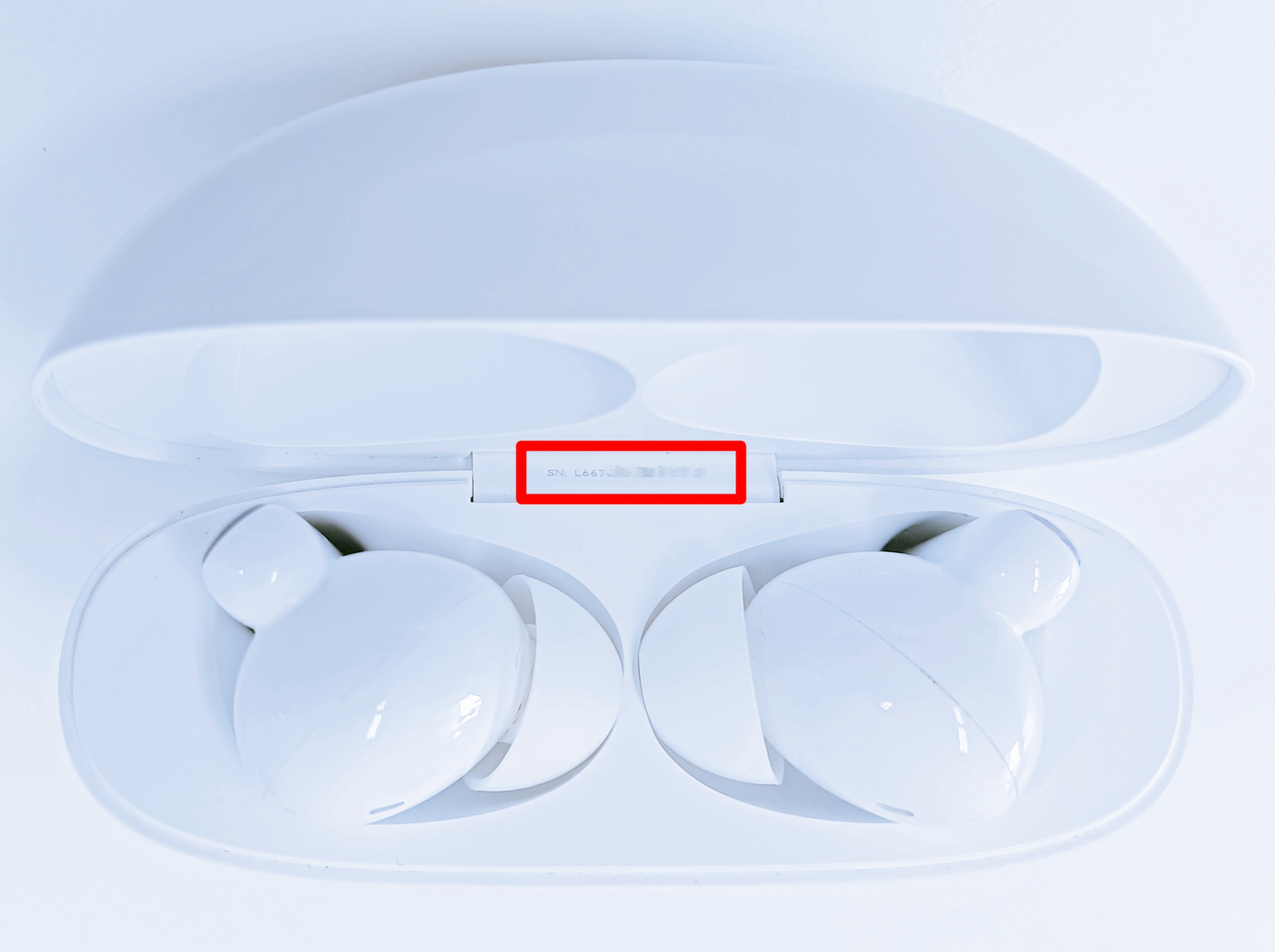 充電ケースの外側や内側に、小さくシリアル番号が記載されている場合があります。