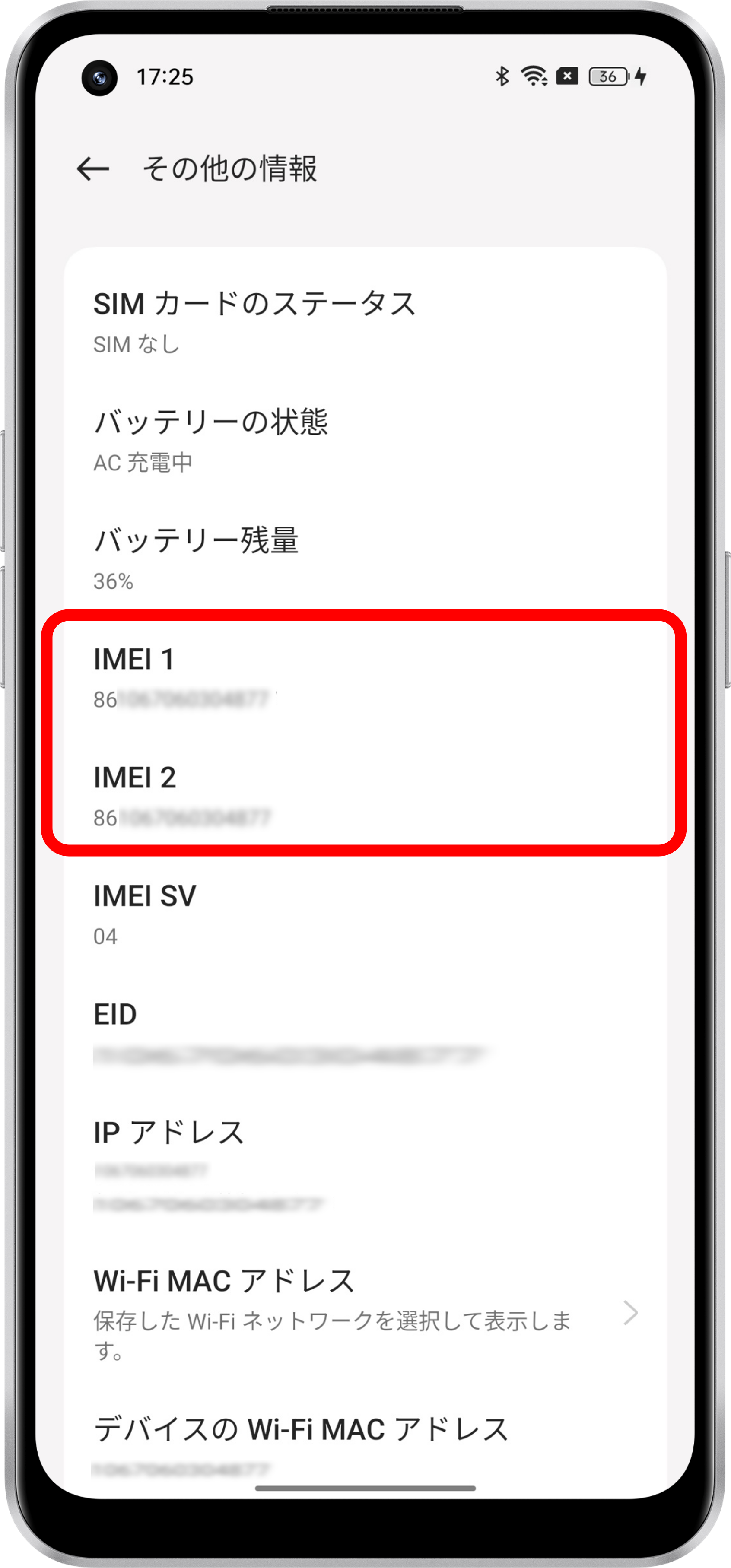 ColorOS 11:[設定]>[端末情報]>[その他の情報]>[IMEI 1] / [IMEI 2]