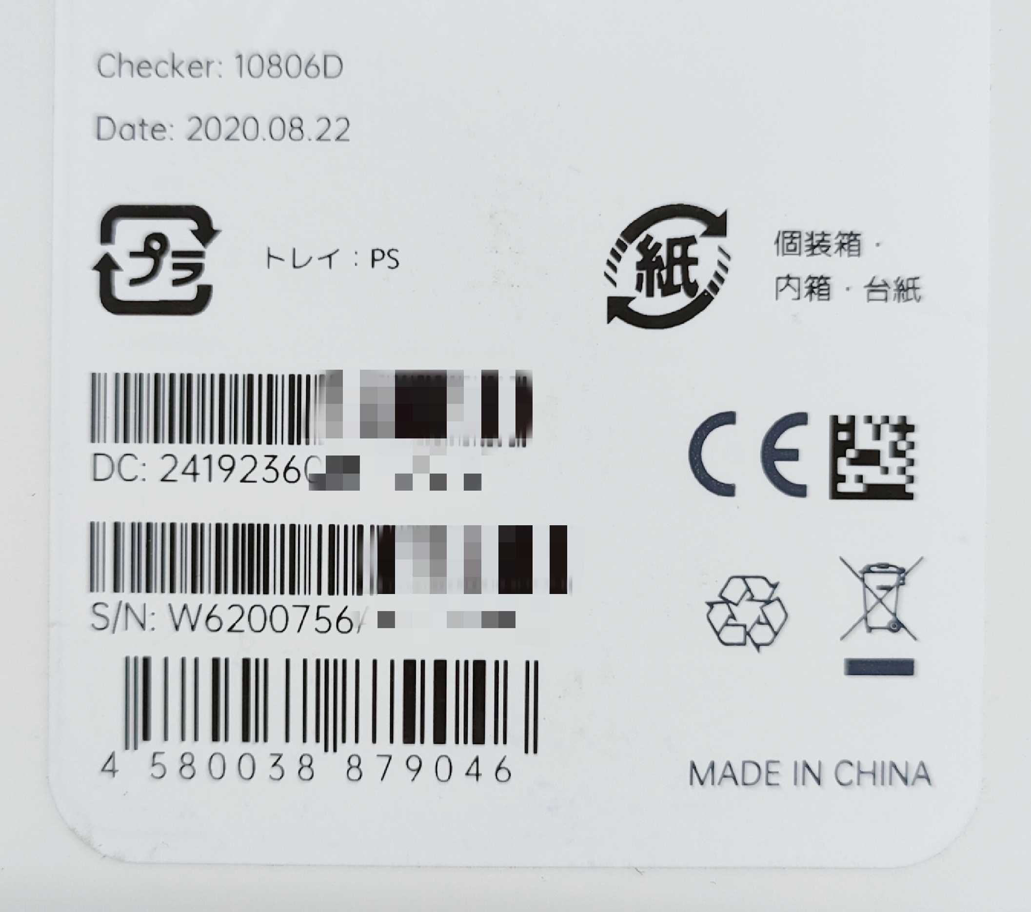 製品の個装箱(外箱)の裏面にあるバーコード付近に、シリアル番号(S/N)が記載されています。