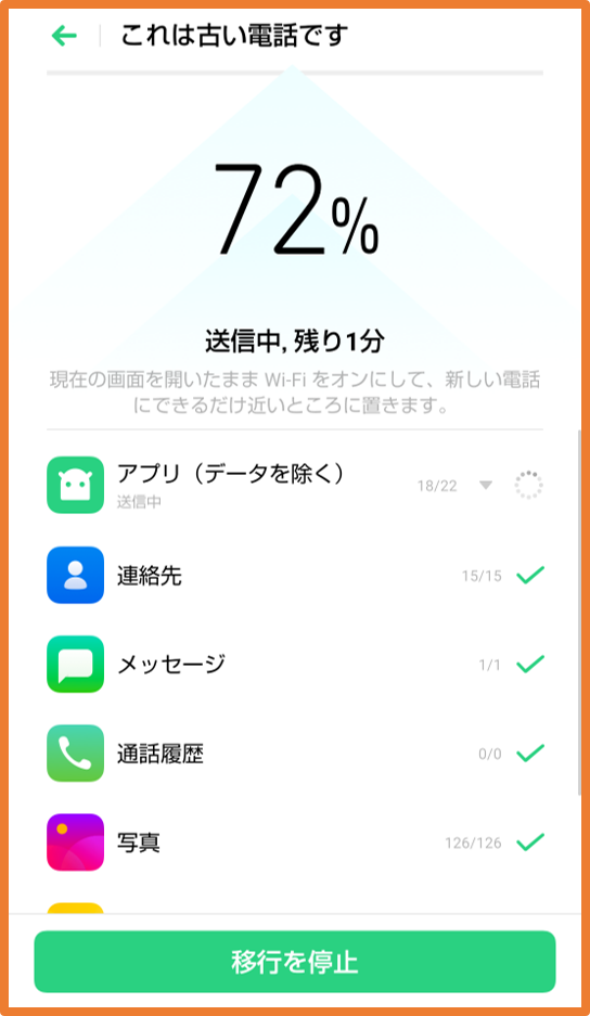 ⑪ 新旧両方の端末で、進捗が表示されます。端末はなるべく近くに並べてください。