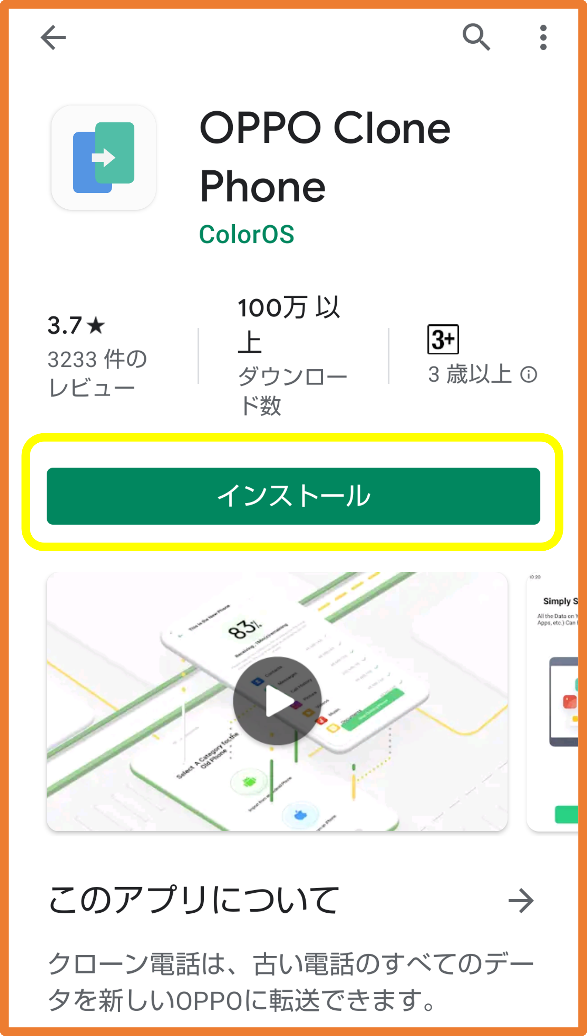 ①まずはあらかじめ、旧Android™端末へ「OPPO Clone Phone」アプリのインストールを行います。以下URLからPlayストアを開くか、直接Playストアで検索しインストールを行ってください。