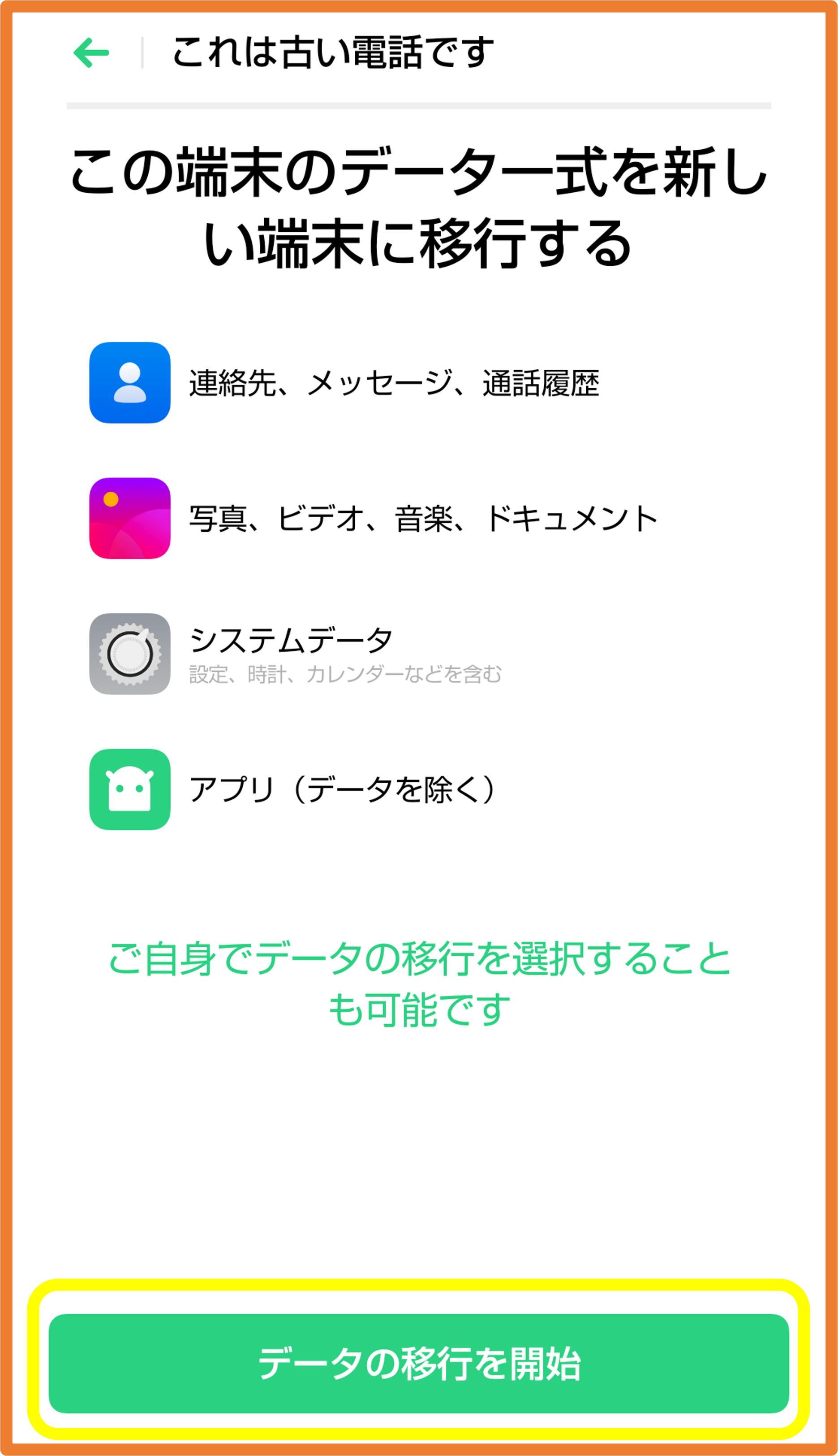 ※LINEのトーク履歴や、ゲームアプリのデータなど、アプリによっては移行できないデータがございます。
