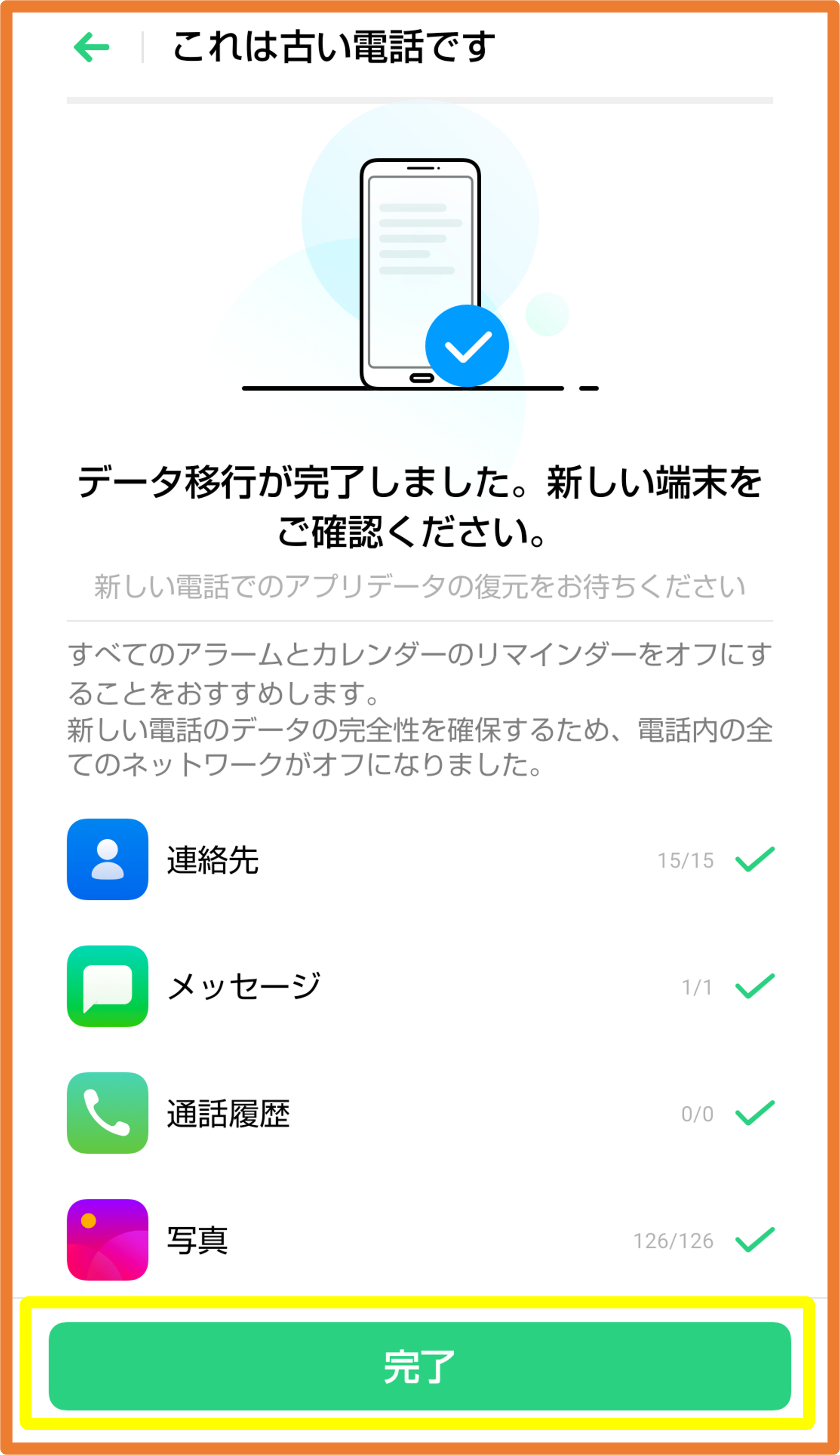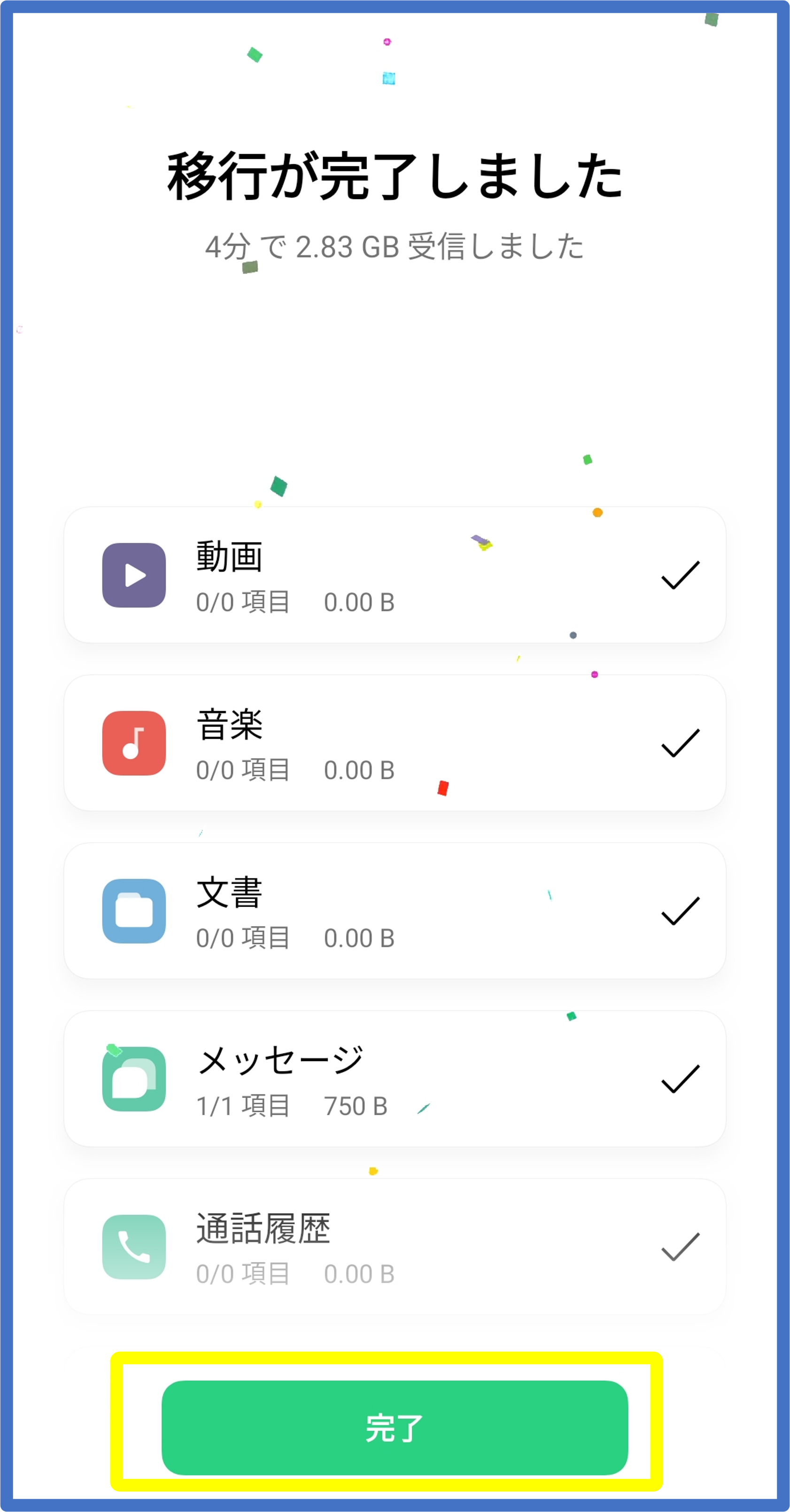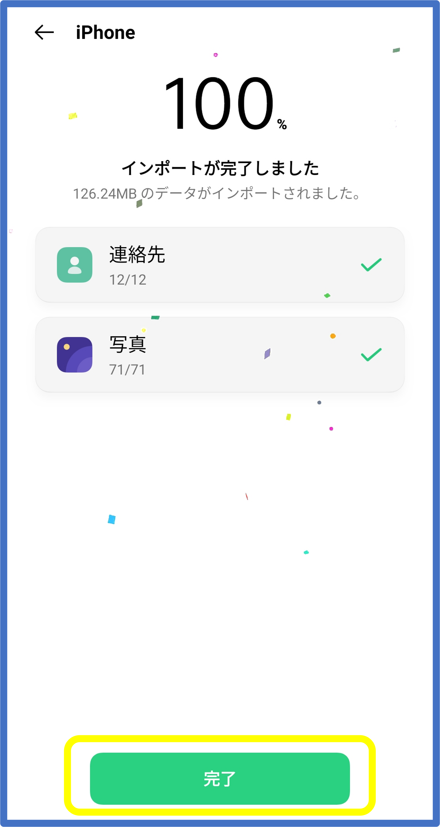 ⑬ データ移行が完了すると、新旧両方の端末に紙吹雪が舞い[完了]が表示されますのでタップします。