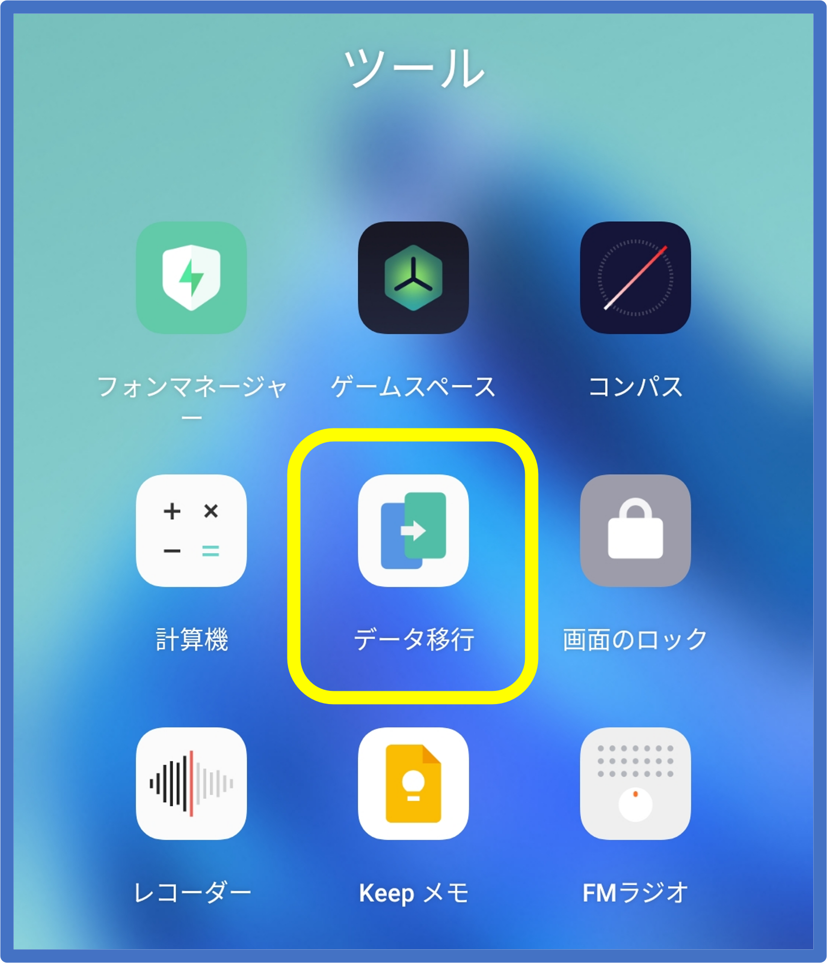 ①旧端末にてホーム画面から「ツール」へ進み、「データ移行」アプリを起動します。