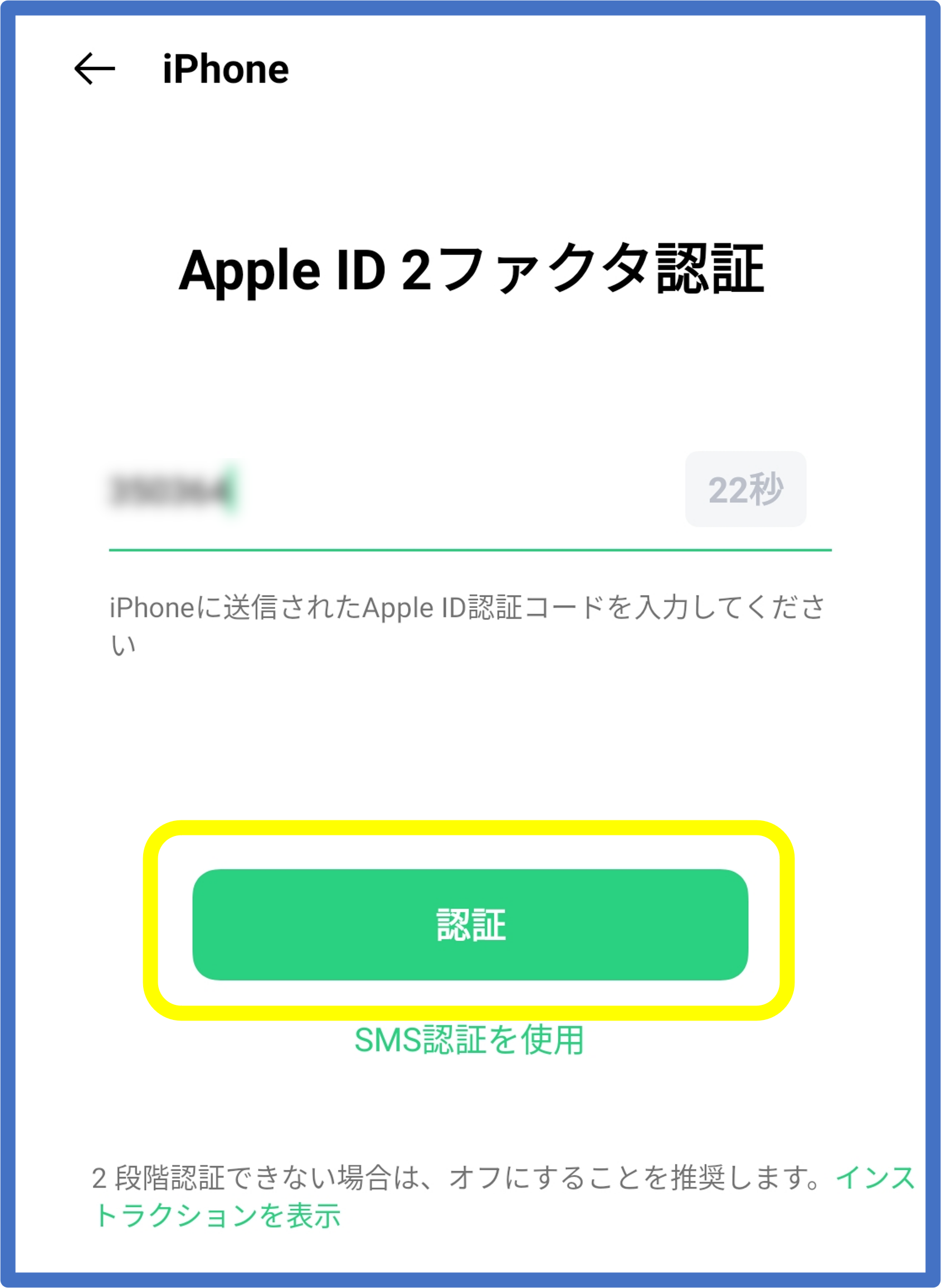 ⑪iPhoneで表示された確認コードを入力し、[認証]をタップします。