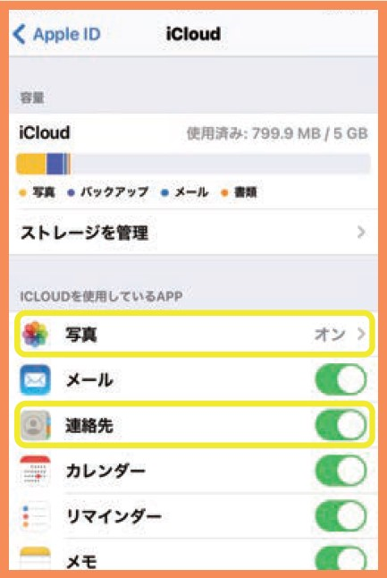 ① あらかじめ連絡先と写真のデータを、iCloudに同期させておく必要があります。