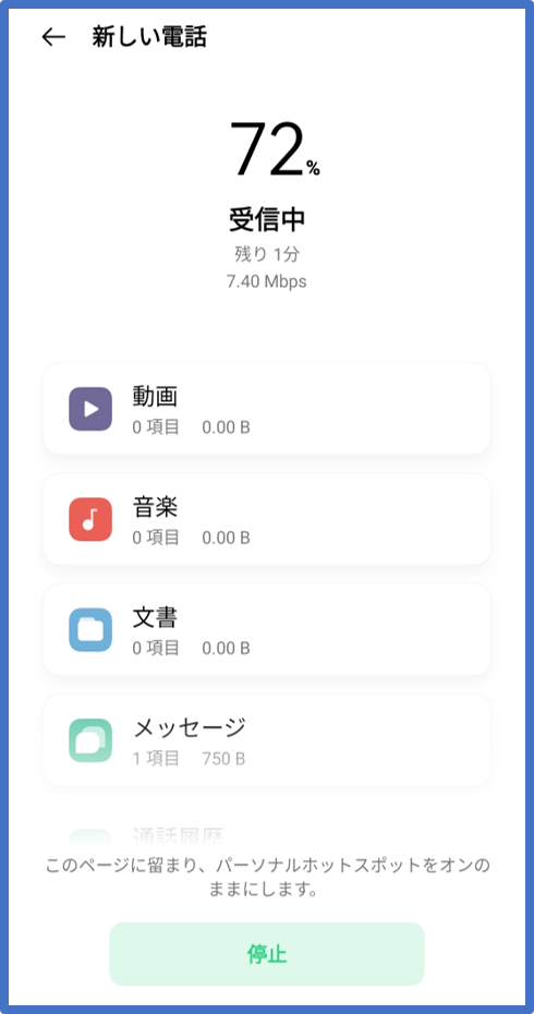 また、本データ移行手順はスマートフォン同士でデータの送受信を行うため、モバイルデータ通信は発生しません。