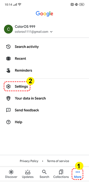 Open the [Google] application > And then tap [More] / your profile picture found at the upper right corner of your OPPO phone's screen > [Settings].