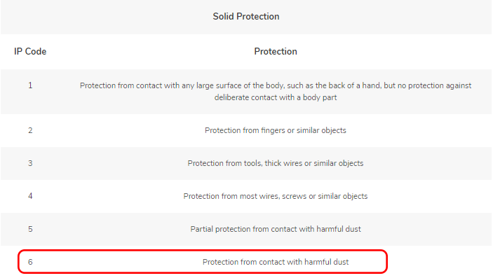 The first digit after IP is the rating the IEC assigned for its resistance to solids. In this case, it’s six (6) – which means no “harmful” dust or dirt seeped into the unit after being in direct contact with the matter.