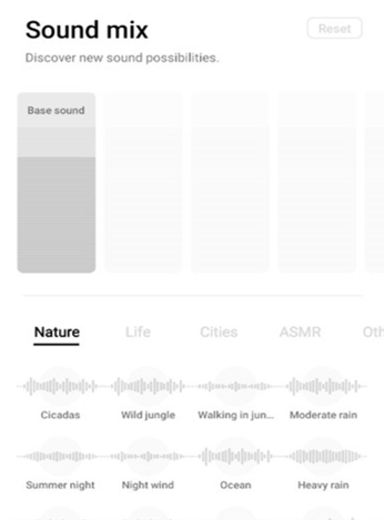 Discover new possibilities with the sound mix as you can create white noise by mixing a wide variety of sounds such as natural, urban, ASMR, and everyday sounds. You can mix up to 6 different sounds.