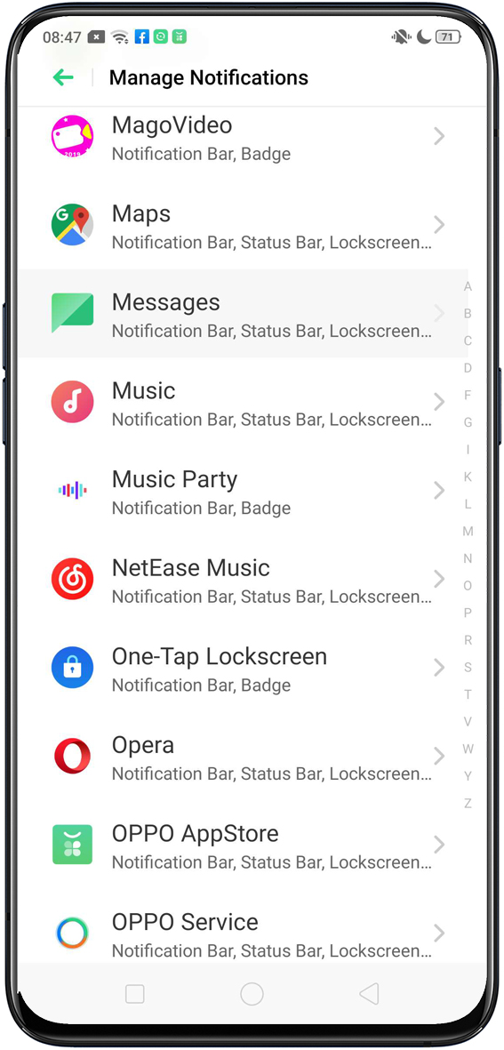 On some OPPO Reno phones that run on different ColorOS versions: Go to [Settings] > [Notifications & Status Bar] > [Manage Notifications] > select an app > enable and disable the notification features according to your preference.