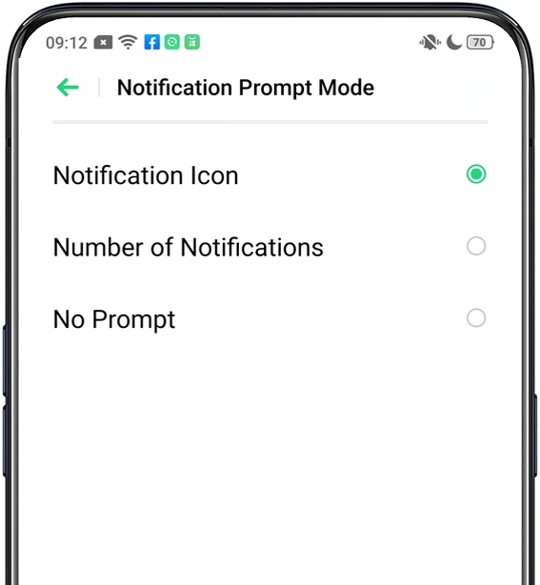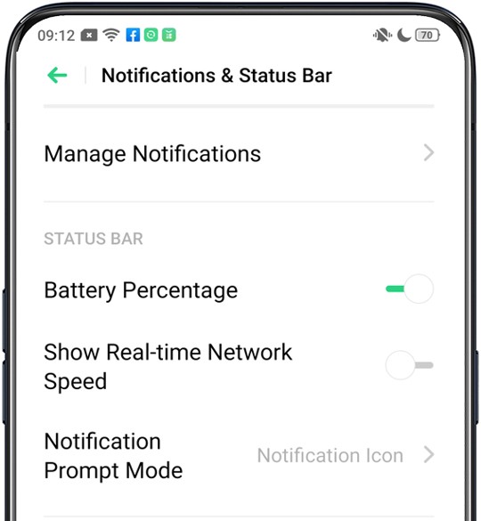 On some OPPO Reno phones: Go to [Settings] > [Notification & status bar] > enable the sliders for [Battery percentage] and [Real-time network speed] > as for the Notification prompt, tap on the [Notification icons] > then choose between [Icons], [Notification count], or [Do not show].