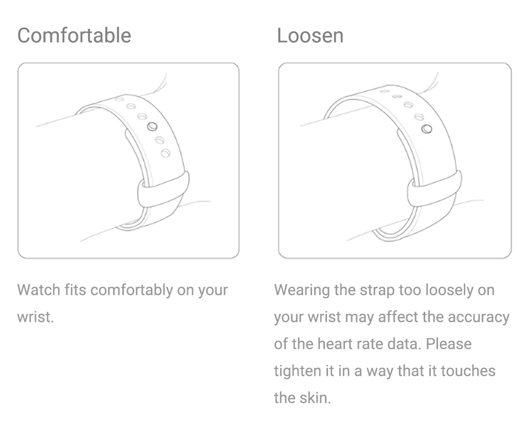 When exercising, please adjust the wrist circumference to a suitable size, not too loose nor too tight. Long-term rubbing or wearing it too tight may make the skin uncomfortable. You may remove the watch when to let your wrist rest properly.