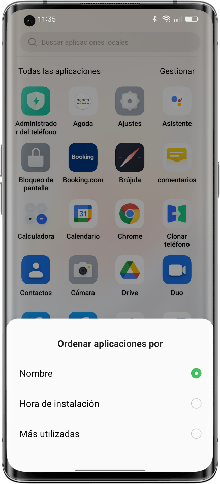 Ruta: Deslice el dedo hacia arriba en la pantalla de inicio, toque [Gestionar] > [Ordenar] y seleccione [Hora de instalación] (o [Más usado]).