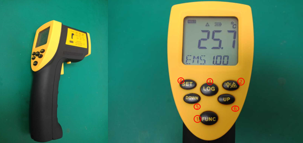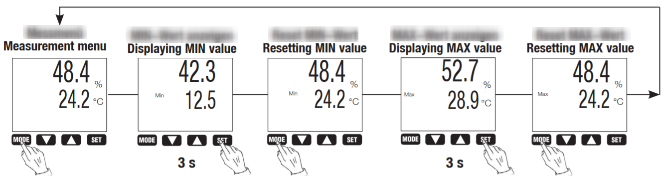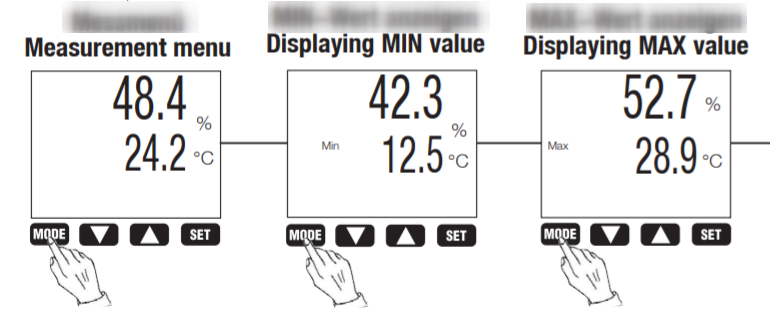 Tahan tombol "SET" selama 3s untuk mengatur ulang nilai maksimum dan minimum, dan tekan tombol "MODE" untuk kembali ke mode pengukuran