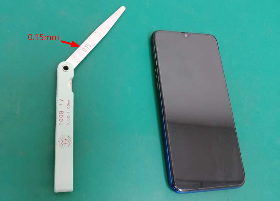 Keterangan:Standar celah pada layar W≤0.15mm. Jika kepingan pengukur celah dapat bergeser bebas dalam celah layar dan tidak terjadi gesekan, maka dinyatakan celah pinggir layar lebih dari standar 0.15mm, ponsel dinyatakan sebagai ponsel tidak normal; jika tidak dapat masuk ke dalam celah atau bisa masuk dan harus dipaksa sehingga terjadi gesekan, maka ponsel dinyatakan normal