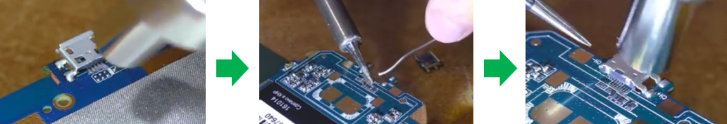 Pengelasan komponen pada papan sirkuit, penggantian motor/vibrator, penggantian port pengisian daya USB dan sejenisnya.