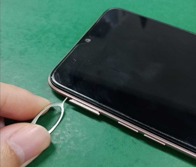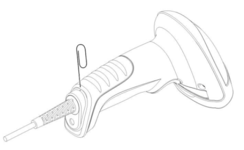 Menggunakan salah satu ujung klip kertas diluruskan untuk dimasukkan ke dalam lubang pelepas. Masukkan jarum ke lubang pelepas dan tekan dengan kuat. Tarik perlahan ujung kabel data yang terhubung ke pistol pemindai, lalu tarik jarum keluar dari lubang, seperti yang ditunjukkan pada Gambar 7-2.
