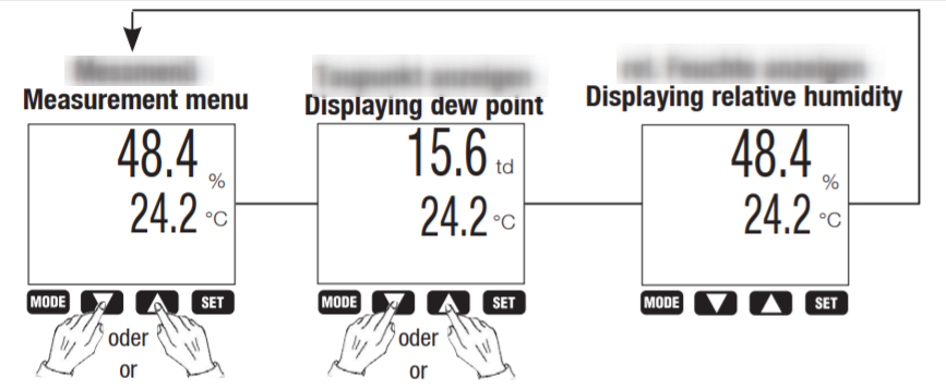 Tekan dan tahan tombol "SET" selama 3 detik, dan "° C atau ° F" berkedip. Tekan tombol panah atas atau bawah untuk memilih tipe parameter tampilan. Setelah pengaturan, tekan tombol "SET" tiga kali untuk kembali ke mode pengukuran