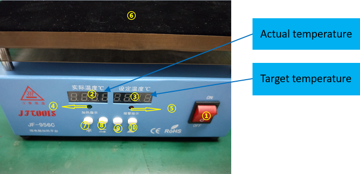 Pengaturan Suhu Normal: Pastikan solder station dalam kondisi suhu yang dapat diatur (masukkan kata sandi), kemudian pada saat mengatur suhu, solder station biasanya akan terkontrol suhu. Tekan tombol “*” selama 1 detik, kemudian pada bagian paling kiri dari angka (ratusan) akan muncul berkedap kedip, tekan “▲” atau“▼” untuk mengubah nilai yang ditampilkan.