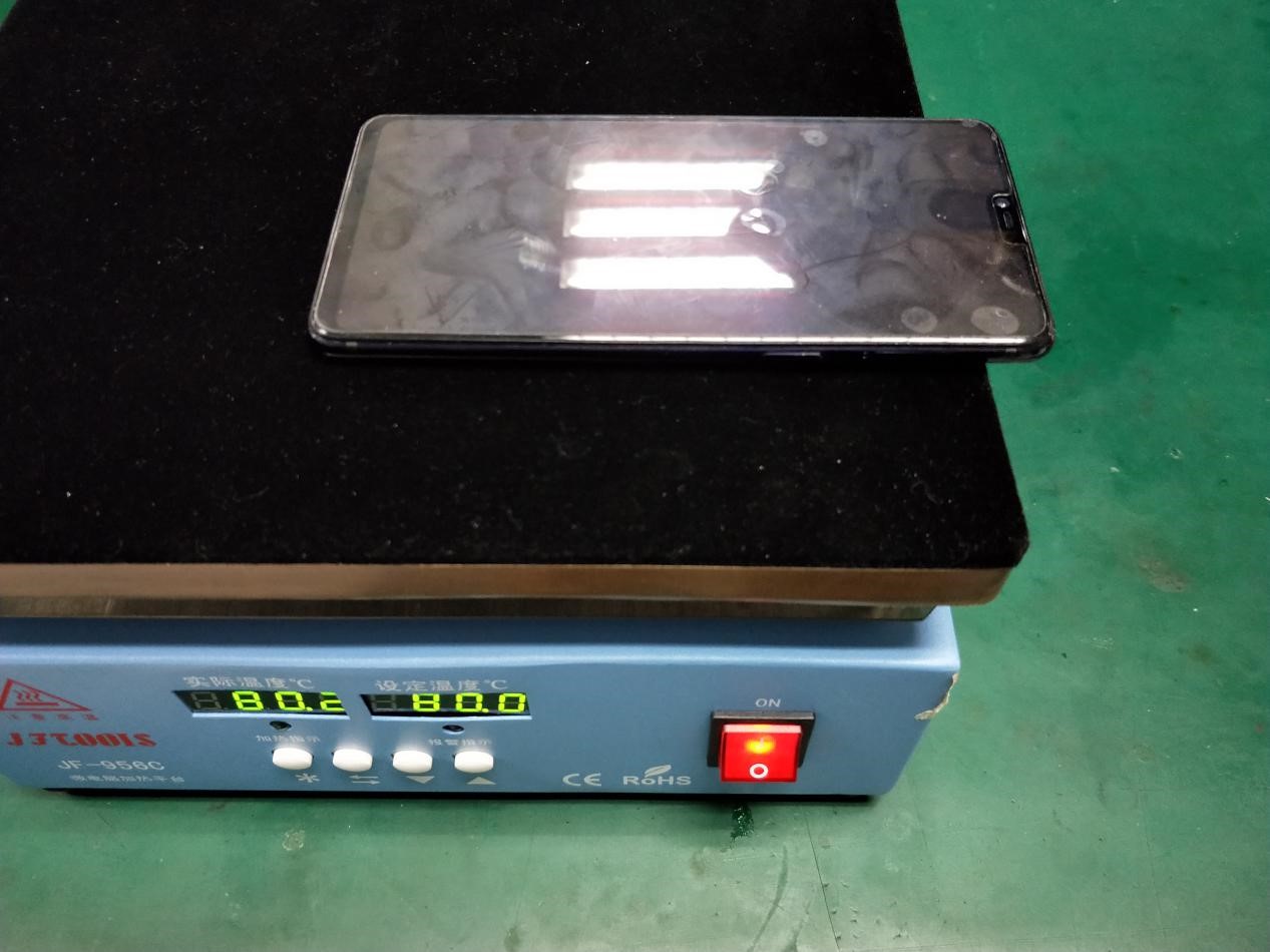 Ketika teknisi Service Center menggunakan udara panas/dryer untuk memanaskan cover baterai, itu akan menyebabkan pemanasan cover baterai yang tidak rata. Dan penggunaan heating platform suhu konstan (kode alat: 535191217) untuk memanaskan cover baterai dari R15 / R15 Dream Mirror Edition dan model-model yang tercantum berikutnya lebih merata. Pemanasan yang seragam lebih baik untuk membantu teknisi pemeliharaan dalam membongkar cover baterai yang menggunakan perekat.