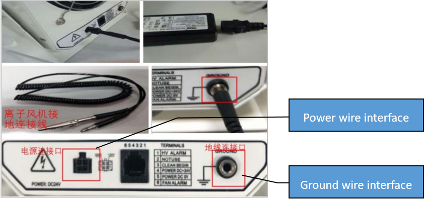 Ada pengait di ujung sambungan kipas ion dan catu daya, yang harus dipasang pada tempatnya agar perangkat tidak rusak karena kontak yang buruk ( 1 kabel untuk menghubungkan dengan perangkat dan 1 jepit buaya untuk dihubungkan dengan grounding) . Tingkatkan keamanan penggunaan peralatan, seperti yang ditunjukkan pada Gambar 2-2.