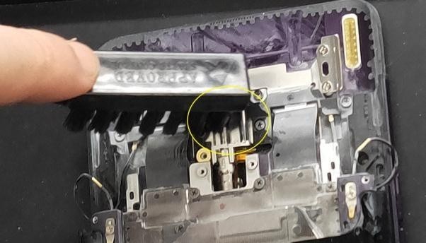 | Bersihkan 2 jalur sliding, slot sliding dan gear box (box motor) dengan sikat yang mengandung etanol (sikat jangan terlalu basah) |
