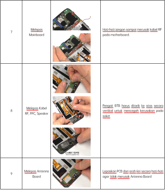 7. Periksa sambungan komponen yang disolder, yang berkaitan dengan perbaikan (seperti, konektor atau sakelar yang disolder) dan solder ulang jika diperlukan (hanya pusat perbaikan yang dapat melakukan kegiatan solder bebas timah). Lepaskan fluks solder yang berlebih setelah melakukan kegiatan penyolderan.