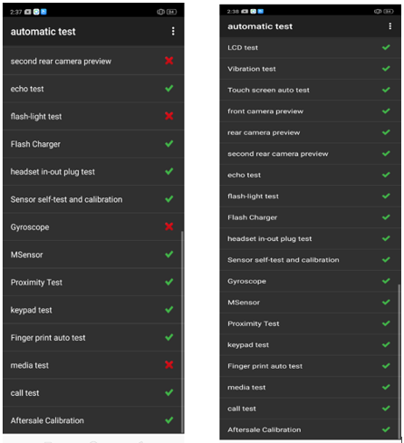 | 11 | Sensor Self-Test dan Kalibrasi | Letakkan ponsel pada meja yang rata, klik pada item kalibrasi pertama. Jika antarmuka menunjukkan “PASS” dan langsung masuk ke uji selanjutnya, maka uji sukses. |