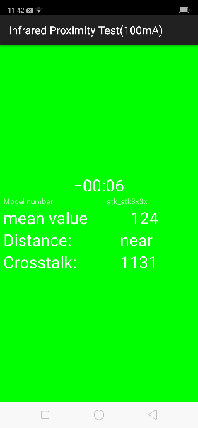 Gunakan telapak tangan untuk menutup lubang sensor cahaya pada antarmuka uji Proximity sensor, layar akan berubah jadi hijau dari hitam. Jika uji berhasil dan langsung masuk ke uji selanjutnya, maka uji sukses |