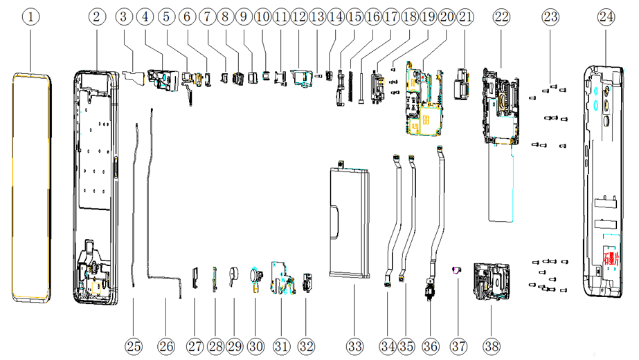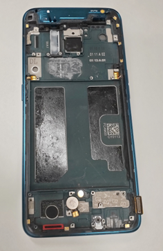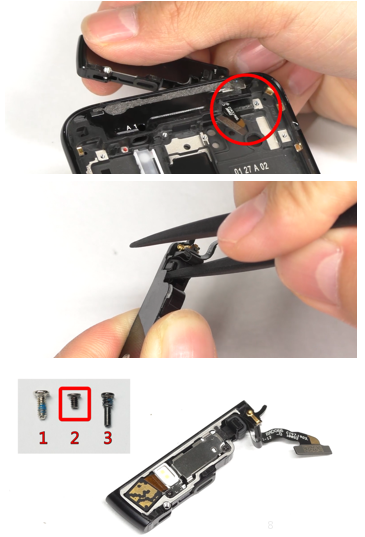 (1) Keluarkan rangka tengah (kecil) dari sudut kiri, perhatikan jangan sampai merusak FPC (gambar lingkaran merah). (2) Gunakan pinset anti-statis untuk mengeluarkan decorative pada bagian sudut kanan bawah rangka tengah (kecil), jangan sampai merusak FPC. (3) Gunakan pembuka sekrup untuk melepaskan 2 buah sekrup (no.2) pada bracket penutup rangka tengah (kecil). (4) Terakhir bersihkan sisa double side yang menempel pada baterai cover, speaker, rangka tengah dengan etanol. |
