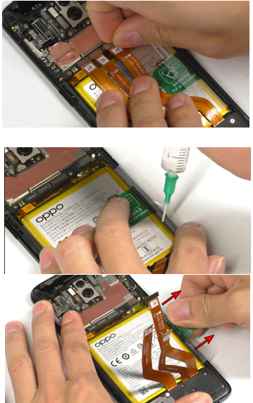 (1) Pasang kabel RF yang lebih pendek pada papan antenna dan ujung satunya yang tidak terdapat kuningan pada sisi lainnya; (2) Pasang papan antenna, jangan sampai merusak FPC fingerprint saat memasang; (3) Pasang kabel RF pada papan 6, kabel RF yang dipasang yang lebih panjang, pasang ujung yang tidak terdapat kuningan pada sisi lainnya. |