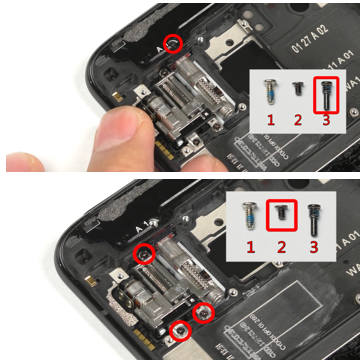 (1) Saat memasukkan papan R ke dalam lubang slot, hati-hati jangan menarik kembali untuk mencegah FPC rusak; (2) Saat memasang motor masukkan ke rangka tengah, setelah sudah masuk, gerakkan ke atas dan bawah utnuk mengunci buckle sliding; (3) Pasang 1 buah sekrup warna hitam panjang (no.3) untuk menyambungkan rangka tengah (kecil) ke layar, jangan sampai salah sekrup. (4) Pasang 3 buah sekrup hitam pendek (no.2) untuk mengunci motor, jangan sampai salah sekrup. |