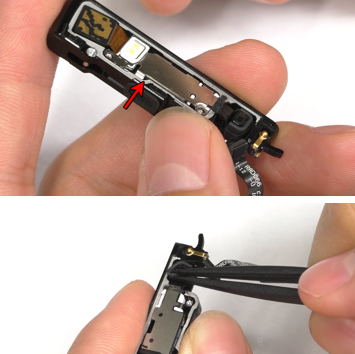 (1) Saat memasang receiver bagian shrapnel menghadap ke atas, setelah terpasang gunakan pinset anti-statis untuk menekan agar tidak keluar dari tempatnya. |