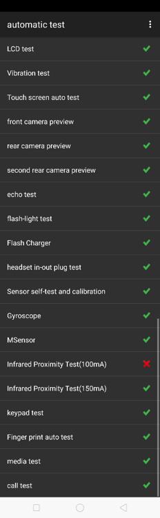 | 14 | Tes Infra Merah (Daya Rendah) | Gunakan telapak tangan untuk menutupi lubang sensor cahaya (pada bagian kanan atas layar), dan layar akan berubah dari hitam menjadi hijau. Jika antarmuka menunjukkan "PASS" maka akan langsung masuk ke tes selanjutnya secara otomatis. |