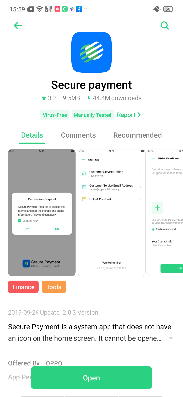 Cara memasang aplikasi terbaru dari Secure Payment: Pergi ke App Market dan perbarui aplikasi Secure Payment.