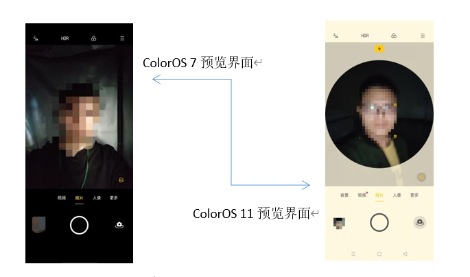 Untuk meningkatkan pengalaman selfie pengguna di lingkungan gelap, ColorOS 11 telah menambahkan fungsi cahaya pengisi pada kamera depan. Saat kamera depan digunakan dan lampu flash dinyalakan, bayangan berwarna putih akan muncul di sekeliling layar untuk mewujudkan fungsi dari cahaya pengisi (seperti yang ditunjukkan di bawah).