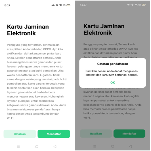 Kami sudah menerima beberapa kasus dari beberapa area yang melaporkan tentang adanya masalah kegagalan saat mendaftarkan kartu garansi elektronik, meskipun dengan akses internet dan kartu SIM dalam penggunaan normal.