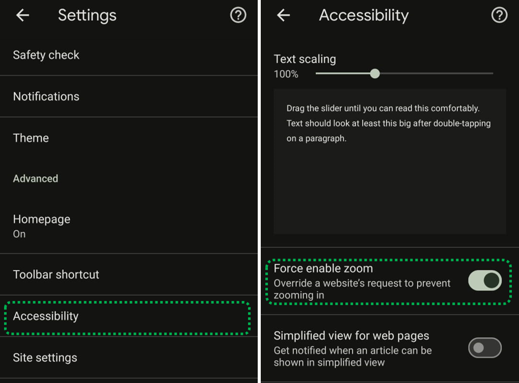 Open [Chrome] > [Menu] > [Settings] > Click[Accessibility] > Turn On [Force Enable Zoom].