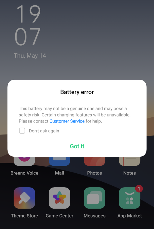 ‘This battery may not be a genuine one and may pose a safety risk. Certain charging features will be unavailable. Please contact Customer Service for help.’