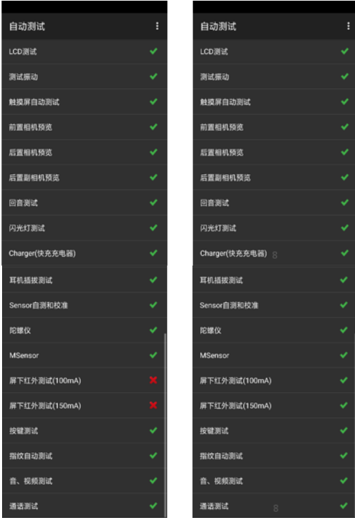 以上19個測試項測試做完後,會跳轉到測試結果介面,若測試PASS的介面會打“√”,測試FAIL的項目會打“X”,如圖7-1所示,顯示“X”的專案需重新點擊進入進行測試,直至顯示如圖7-2所示: