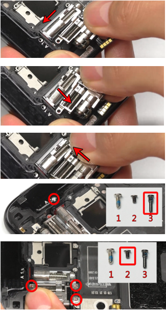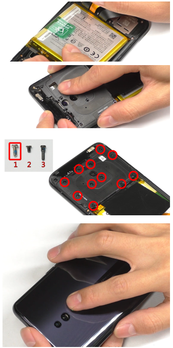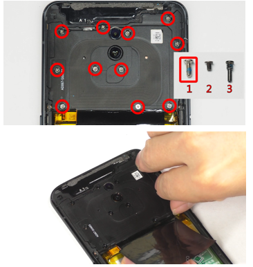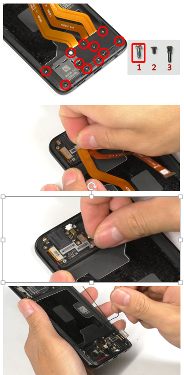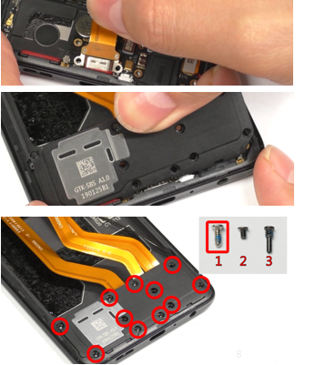 | 4 | Disassemble the speaker, small board end FPC and RF cable | Loosen the 11 (1#) screws with a screwdriver. Note: the screws here are 1#; Distinguish the 3 types of screws. |