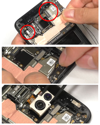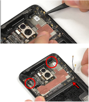 | 7 | Install the RF cable on the mainboard end, mainboard and the rear camera | |