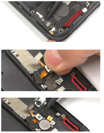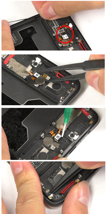 | 5 | Disassemble the antenna board, motor, fingerprint module and antenna board (6 boards) | (1) Avoid breaking the weak part and fingerprint FPC (red circle circled in the figure) when removing the antenna board from the right side, (2) When removing the motor, add 0.1ml of alcohol to the edge and lift it from the side with plastic tweezers. (3) When removing the fingerprint IC, add 0.1ml of alcohol from the edge to remove the fingerprint FPC and remove the fingerprint sensor. |