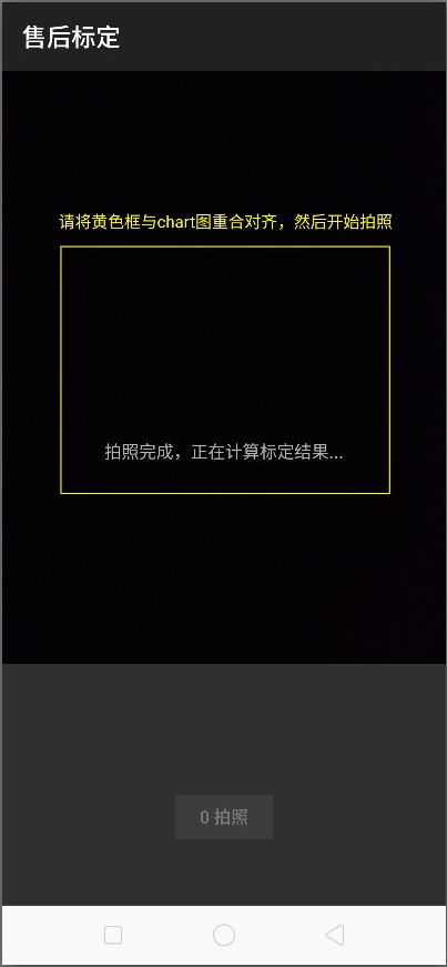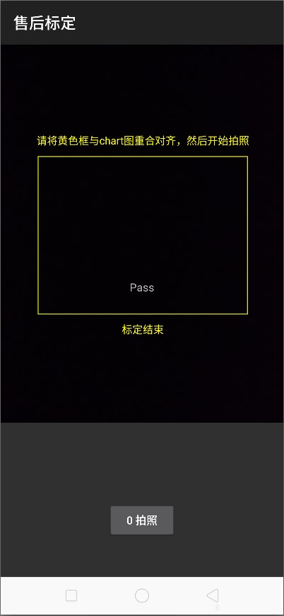 1. 1. Please align the yellow box with the edge of the chart, and then take a Photo. Then, do not operate the phone when the phone enters the computing interface until it displays “Pass” with the calibration completed.