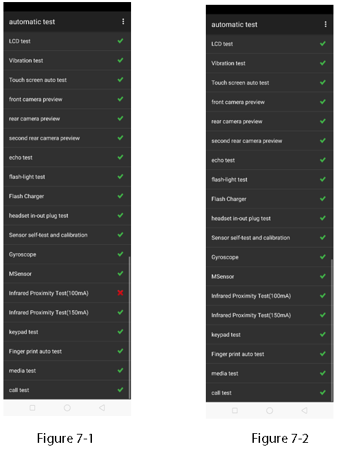 | 14 | Proximity-sensor Test(100mA) | Use the palm to cover the light sensor hole, and the screen will turn green from black. If the interface shows “PASS” and jumps to the next test, the function is sound; |