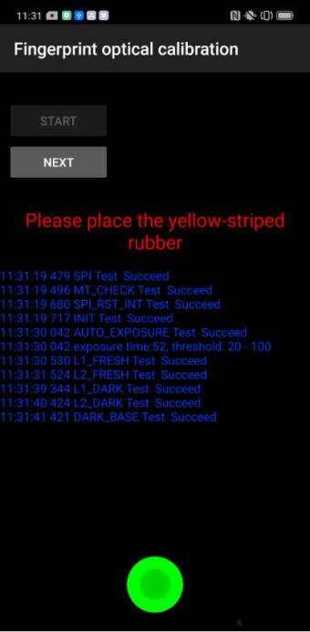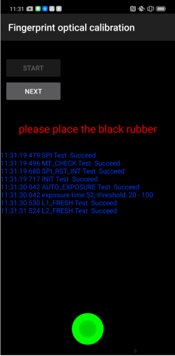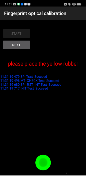 | Operation | 1. Click "START" to start calibration after it jumps into the fingerprint optical calibration, | 2. According to the prompt "please place the yellow rubber ", put the yellow rubber on the fingerprint spot area (the groove is facing down), and click "NEXT" until it prompts " please place the black rubber". |