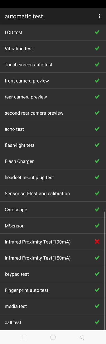 | 16 | Proximity-sensor Test(100mA) | Use the palm to cover the light sensor hole, and the screen will turn green from black. If the interface shows “PASS” and jumps to the next test, the function is good; |